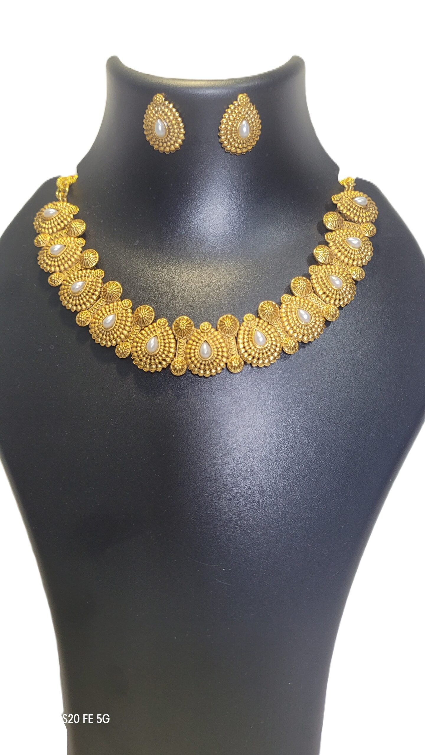 Elevate your traditional style with this exquisite antique gold-plated necklace set, beautifully crafted with intricate detailing and ruby teardrop stones. The rich golden finish gives it a royal vintage charm, while the precision-crafted motifs add timeless elegance. Paired with matching earrings, this set is ideal for weddings, festive functions, and cultural events. Lightweight and durable, it complements sarees, silk outfits, and other ethnic wear effortlessly. Designed to bring out your inner diva, this jewellery set is a must-have for every traditional wardrobe.