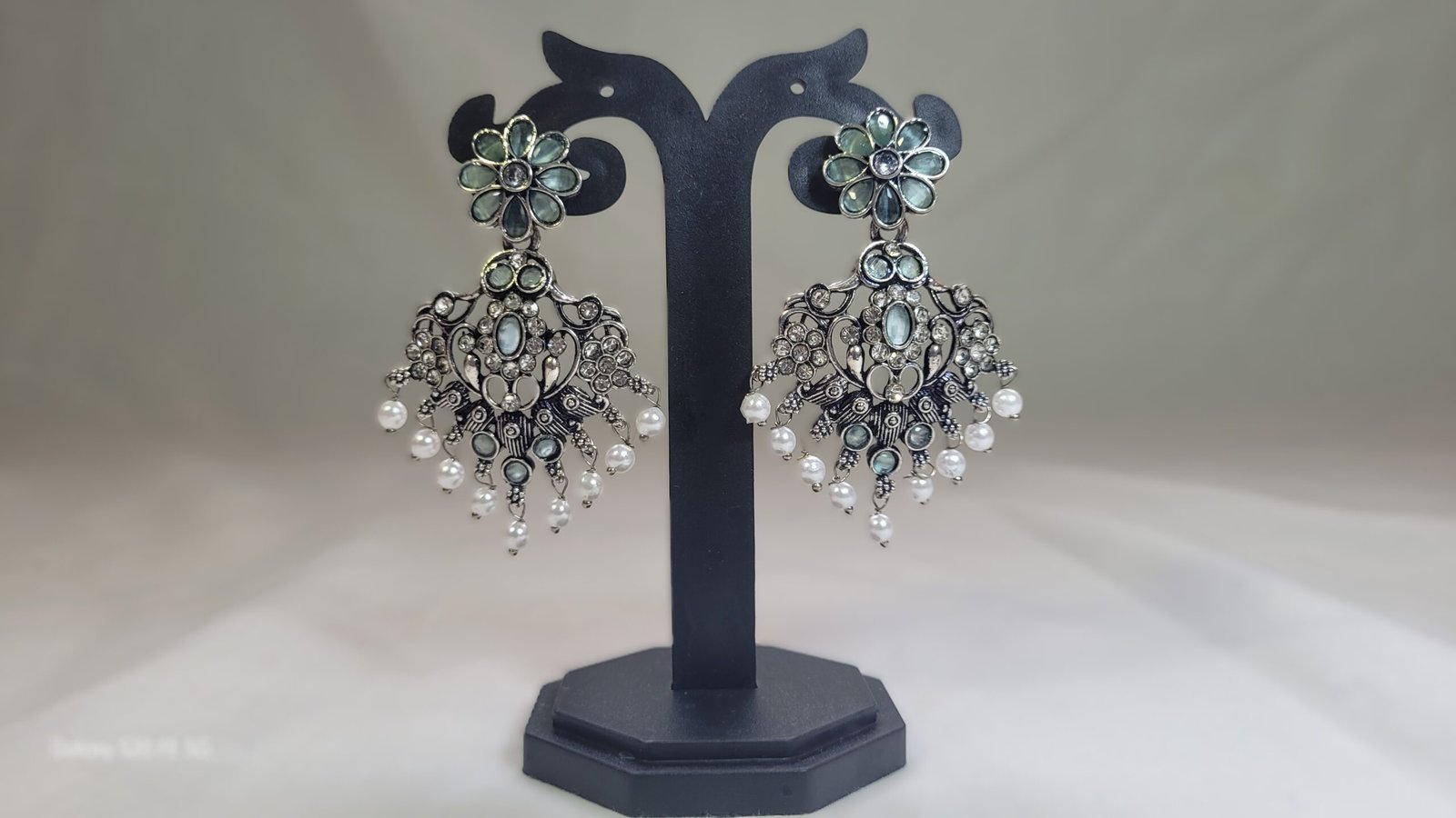 Enhance your traditional look with these stunning oxidised silver chandbali earrings, beautifully designed with mint-green stones and intricate floral detailing. The earrings feature a rich antique finish, highlighted with sparkling stones and delicate pearl hangings that add graceful movement.