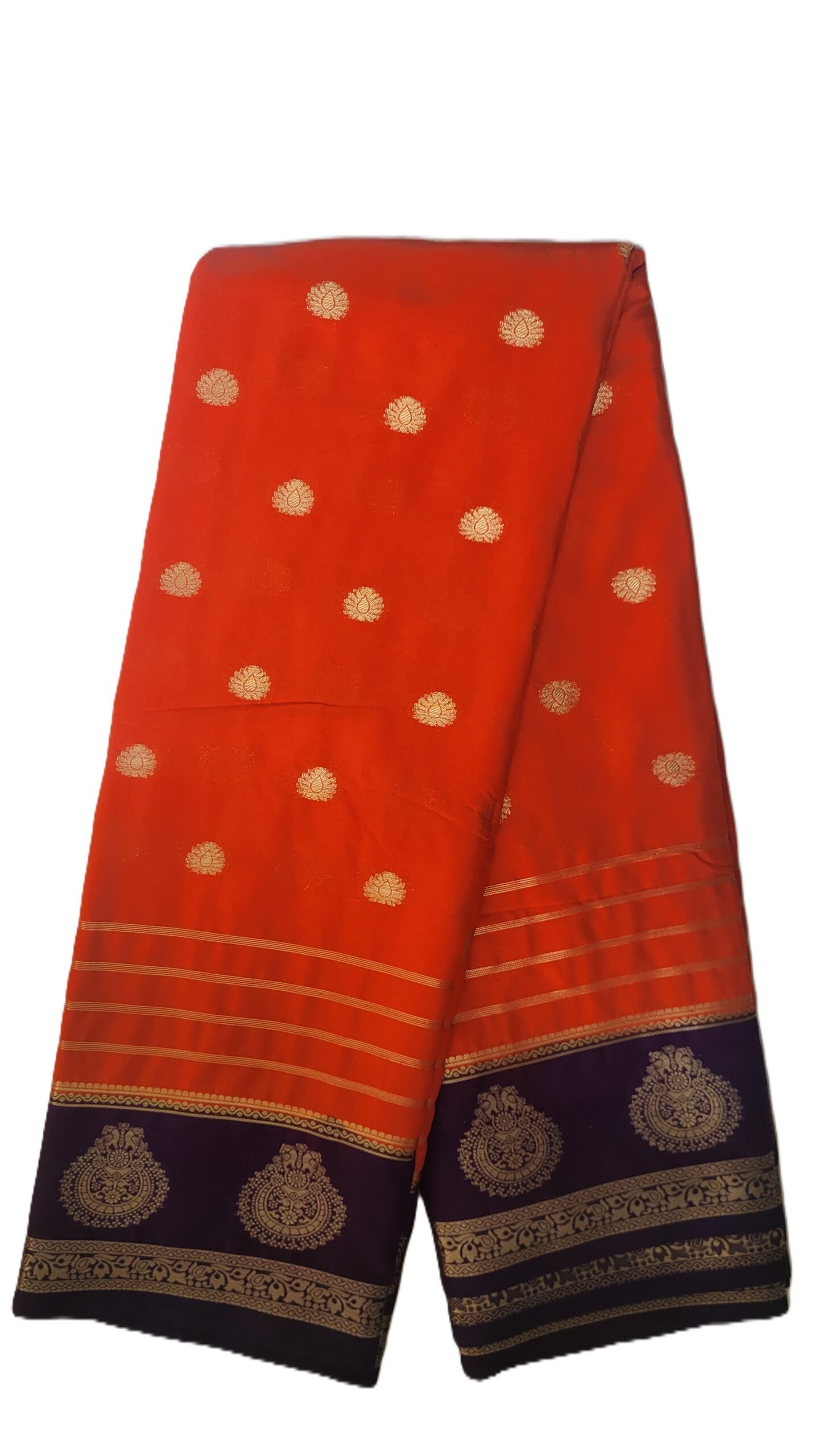 Main Body: Bright Orange with elegant golden zari motifs spread throughout.