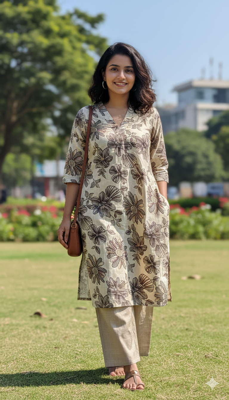 Upgrade your everyday style with this elegant Floral Beige Vatican Co-ord Set, designed for comfort and effortless charm. The kurti comes with a beautiful all-over floral print, a soft V-neckline, and 3/4th sleeves, giving it a modern yet ethnic touch. Paired with matching straight-fit pants, this outfit ensures a polished and graceful look for any occasion.