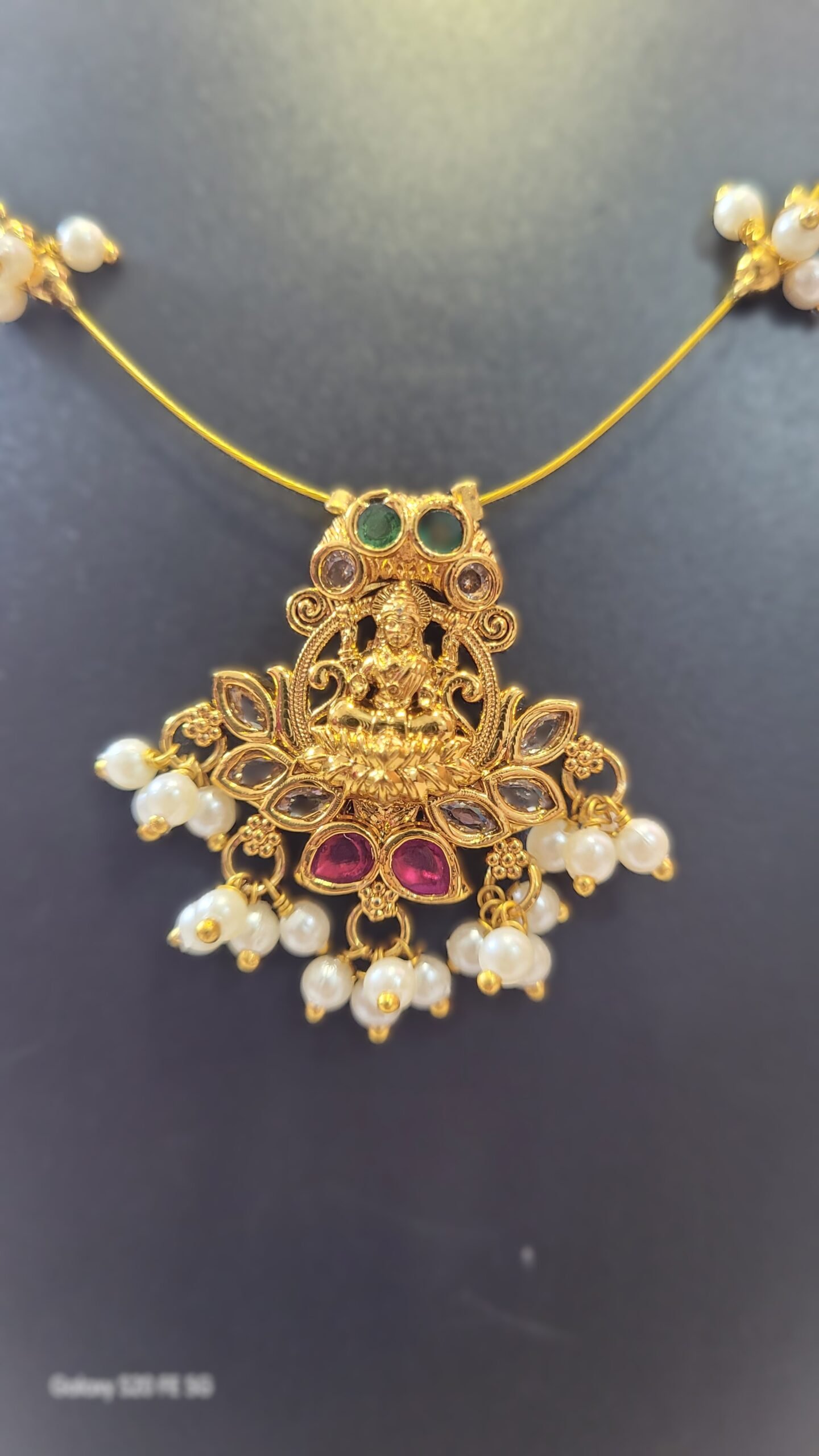 This elegant Lakshmi Temple Pendant Necklace is crafted with a beautiful antique finish and paired with a fine golden chain. The pendant features a detailed carving of Goddess Lakshmi, symbolizing prosperity and divine grace. Adorned with red, green and white stones, along with hanging premium pearl droplets, this piece adds a timeless traditional charm to any outfit.