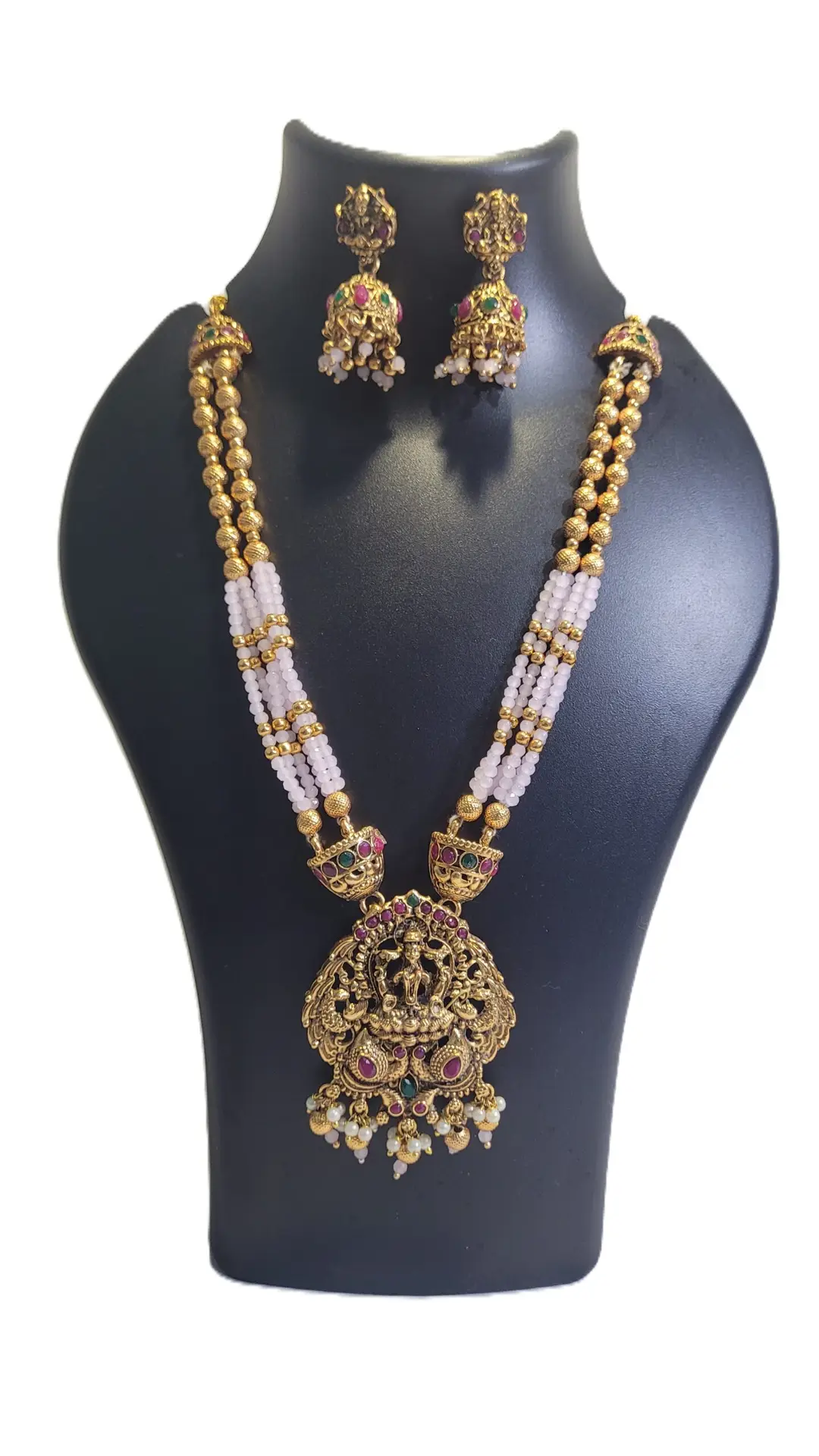 Enhance your traditional look with this exquisite Lakshmi Divine Temple Jewellery Set, beautifully designed to reflect South Indian heritage and craftsmanship. The set features a gold-plated temple-style pendant depicting Goddess Lakshmi, adorned with ruby, emerald, and pearl embellishments. The elegant dual-layer beaded chain adds a touch of sophistication, making it perfect for festive occasions, weddings, and cultural events.