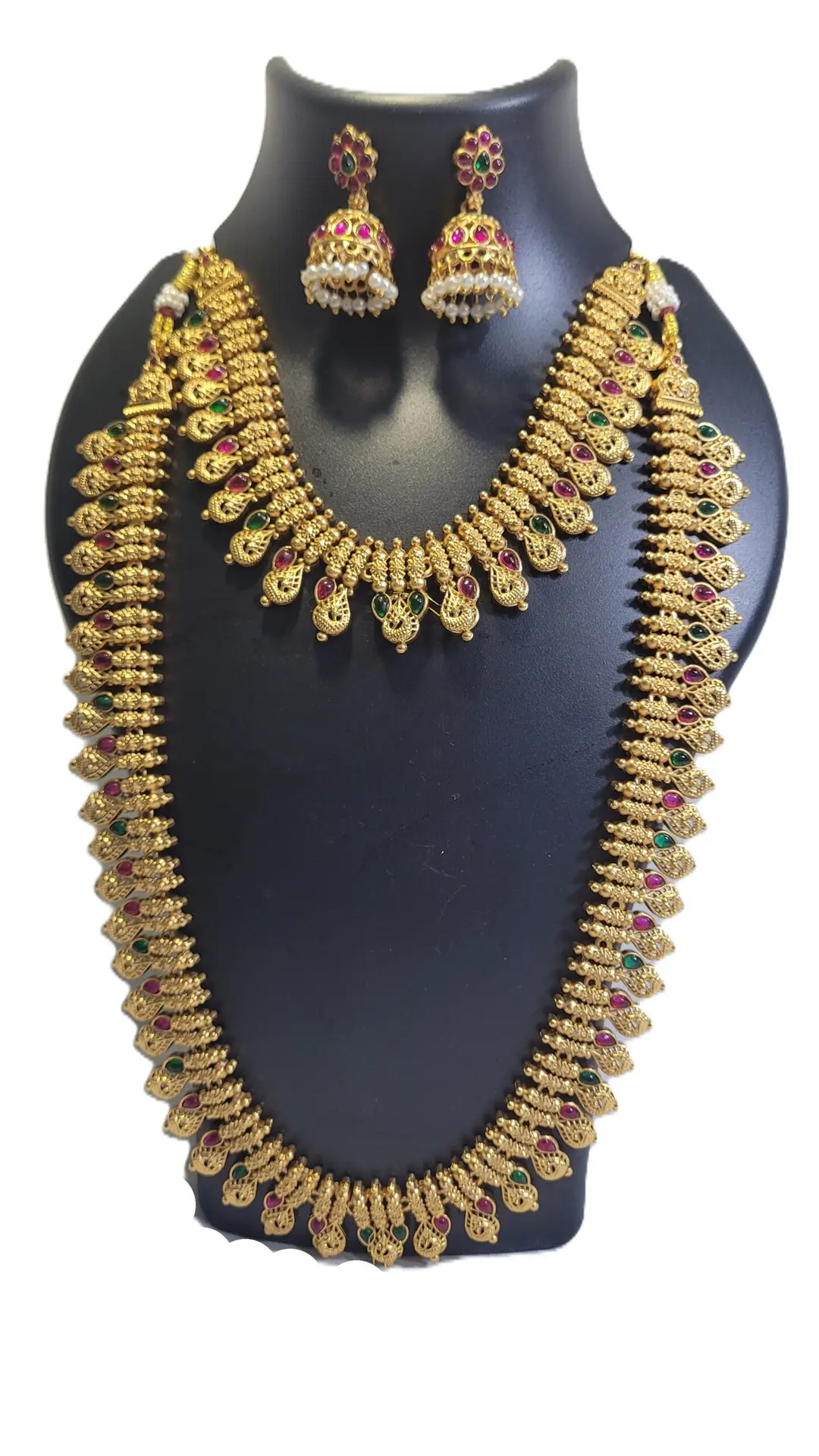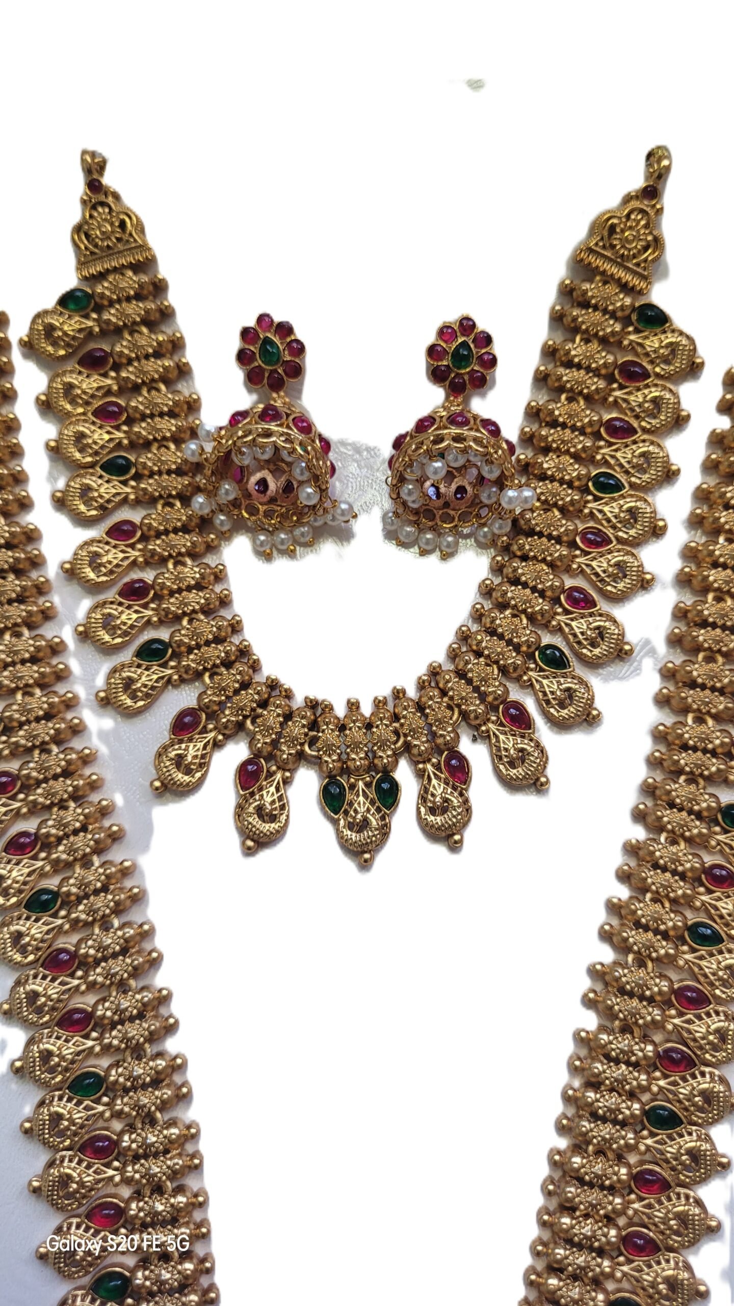 This complete set includes a long haram necklace, short choker necklace, and matching earrings, designed to complement silk sarees, bridal lehengas, and half-saree looks. The intricate Goddess Lakshmi-style motifs and pearl detailing bring a luxurious ethnic appeal.